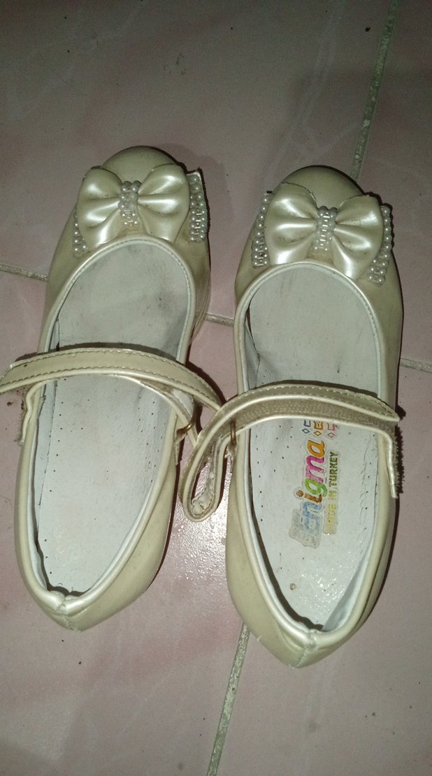Kız çocukları için beyaz tokalı babet ayakkabı, parmak ucunda inci detaylı fiyonk süsüyle. Esnek kauçuk malzemeden yapılmıştır. ✨