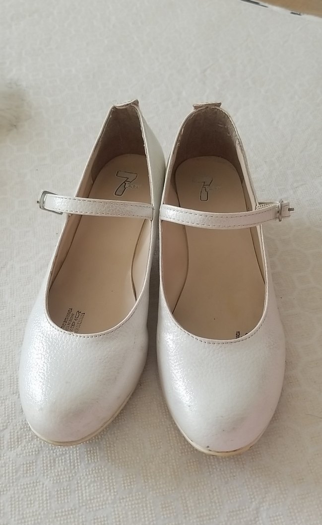 Parlak beyaz, tokalı kayışlı kız çocuk babet ayakkabı. Dayanıklı kauçuk malzemeden yapılmış, klasik şıklık sunar.