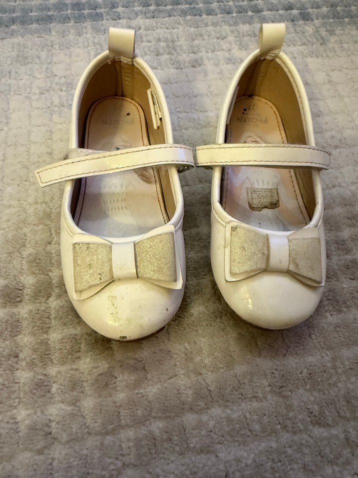 Kız çocukları için beyaz babet ayakkabı, tokalı ve fiyonk detaylı. Yumuşak, kauçuk benzeri malzemeden, klasik ve günlük kullanım için uygun. 27 numara bir kaç yerinde yıpranması var detayları fotoğraflaeda görebilirsiniz