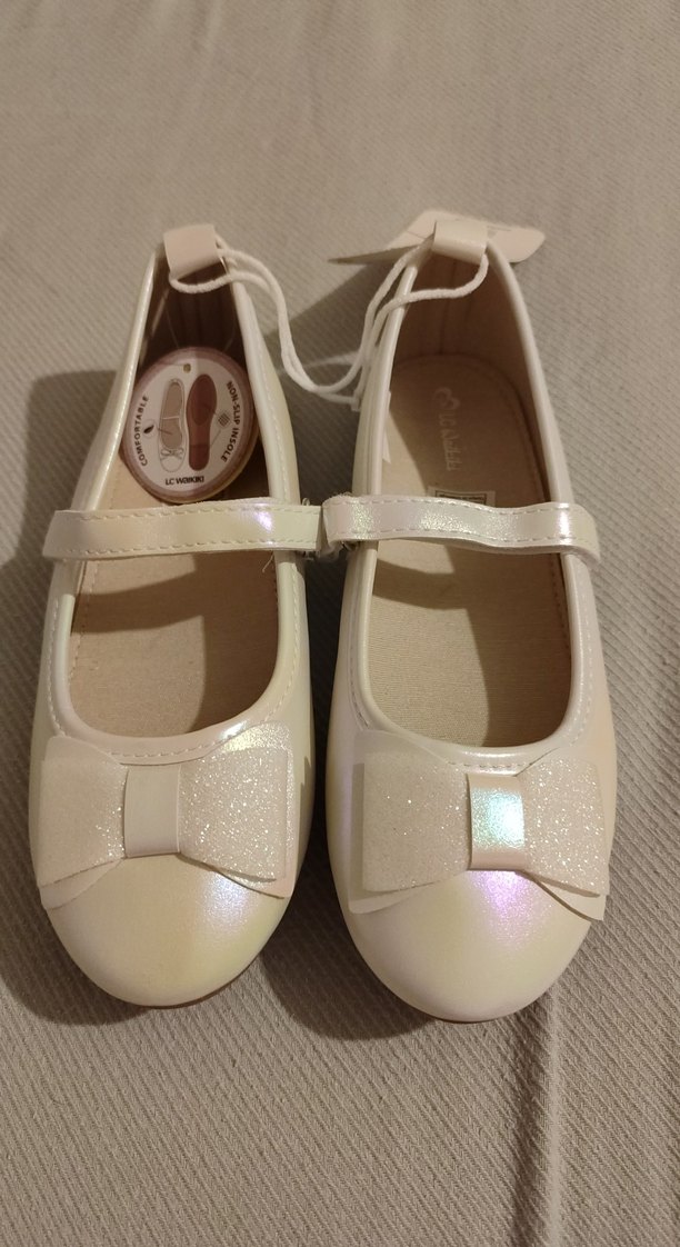 Kız çocukları için beyaz tokalı babetler, önü hafif fiyonklu ve kauçuk malzemeden yapılmıştır. Modern ve klasik şıklığı bir arada sunar.