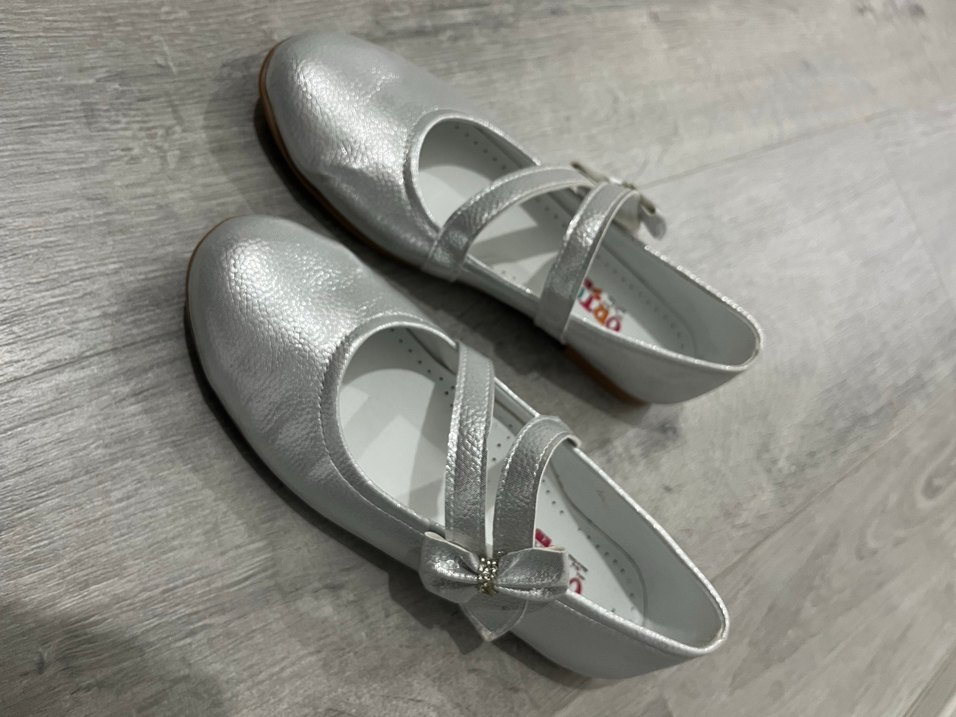 Kız çocukları için beyaz, tokalı bantlı ve küçük fiyonk detaylı bale düz ayakkabı. Yumuşak kauçuk malzemeden, sade ve klasik tasarımda.