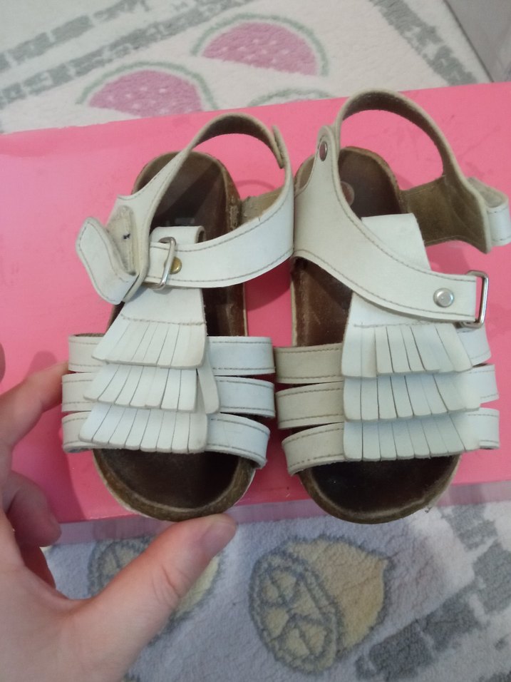 Beyaz tokalı, yumuşak kauçuk malzemeden yapılmış bohem tarzda kız çocuk sandaletleri.