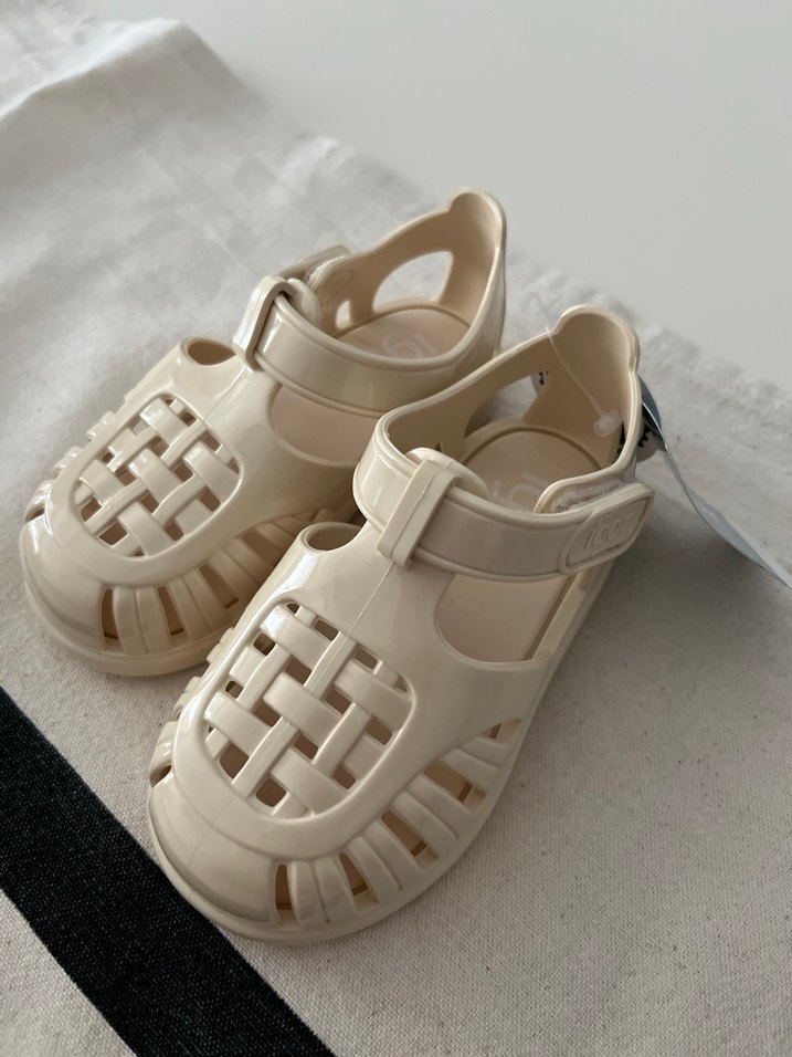 Kız çocukları için kauçuk malzemeden yapılmış, açık beyaz renkte, tokalı ve desen içermeyen sade sokak stili sandaletler.