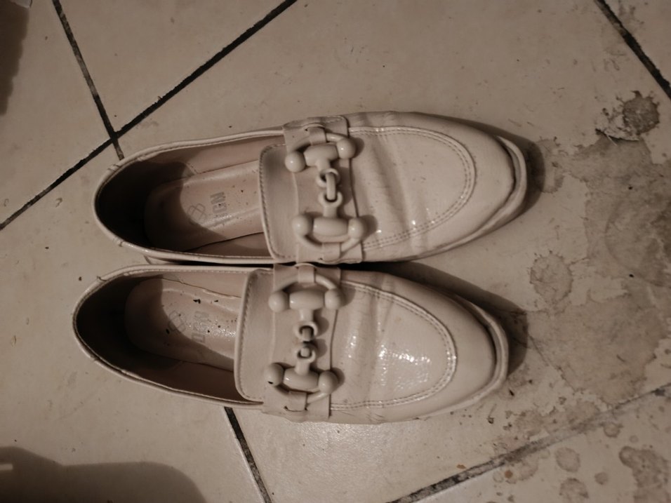 Kız çocukları için tokalı, beyaz renkli loafer ayakkabılar. Lastik tabanlı, desen içermeyen ve gri detaylı sokak stili ayakkabı. 38 no
