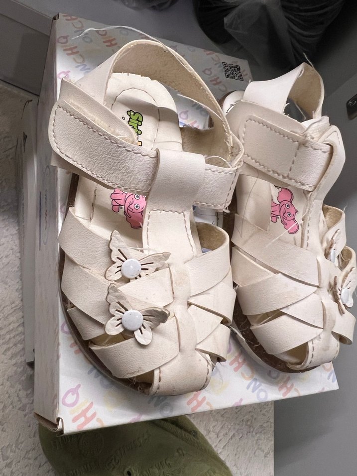 Beyaz kauçuk kız çocuk terlikleri, tokalı kayışlar ve nakışlı kelebek detaylarına sahiptir, trend sokak stili için uygundur .sandalet deri ve ortopedik