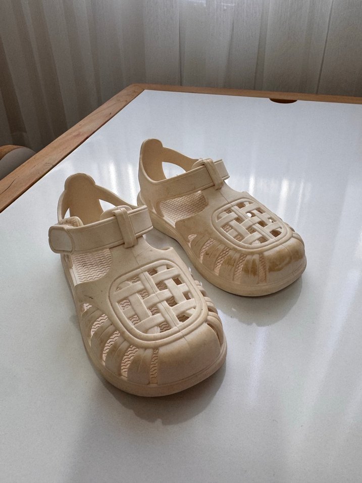 Kız çocukları için beyaz, tokalı, klasik tasarımlı, yumuşak ve esnek kauçuk malzemeden yapılmış sandaletler. Pastel tonlarda, desensiz model. Lekesin maalesef cıkartamadım