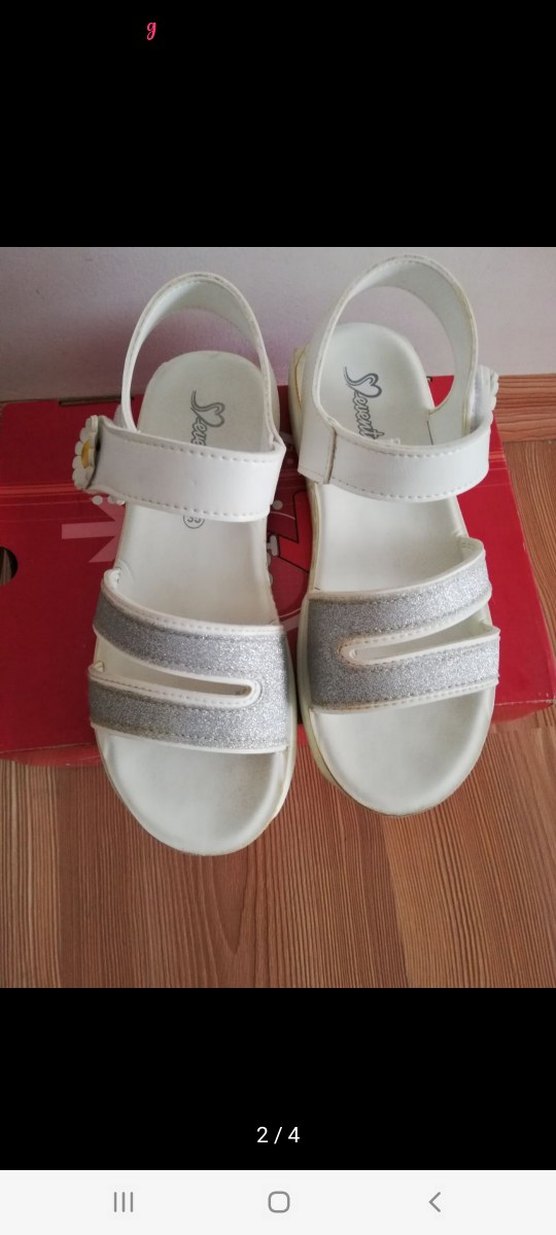 Beyaz tokalı kız çocuk sandaletleri, ön kısmında gri simli detaylıdır. Rahat kauçuk malzemeden yapılmıştır, günlük kullanım için uygundur.
