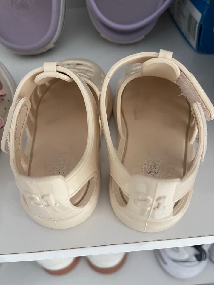 Kız çocukları için açık beyaz renkte, tokalı tasarıma sahip kauçuk terlik. Sokak modasına uygun, rahat ve desensiz.