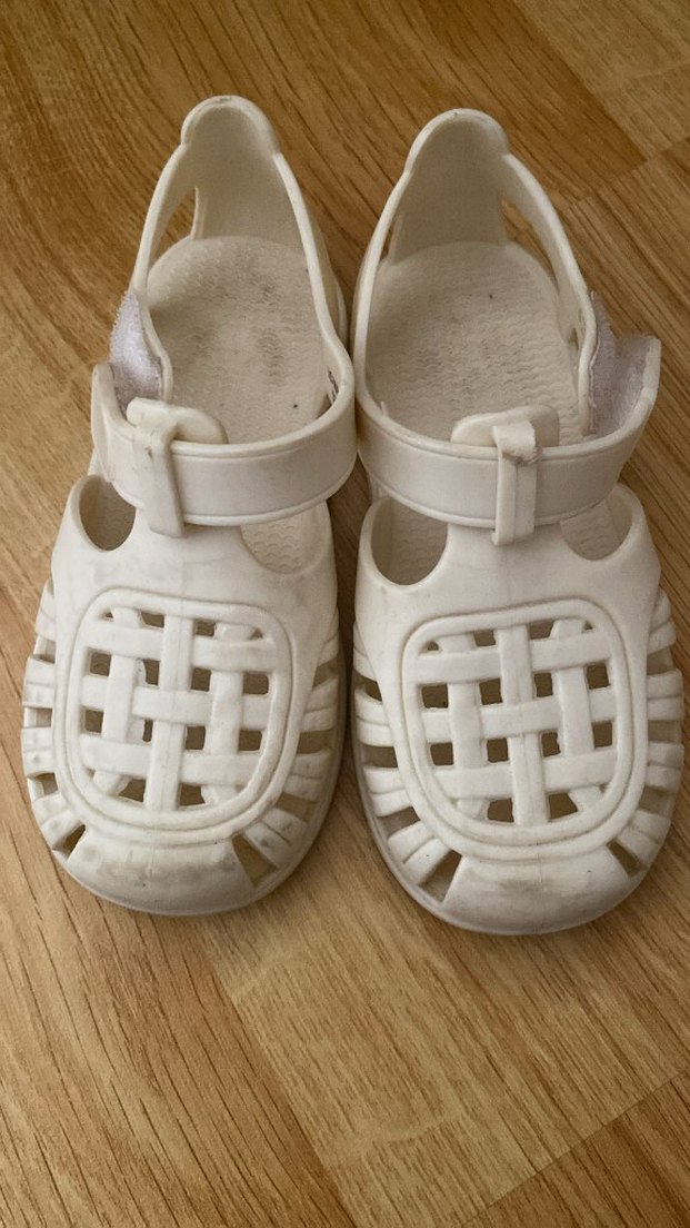 Beyaz renkte, tokalı ve kauçuk malzemeden yapılmış kız çocuk terliği. Pastel tonlarda, desen içermeyen klasik tarzda bir model.