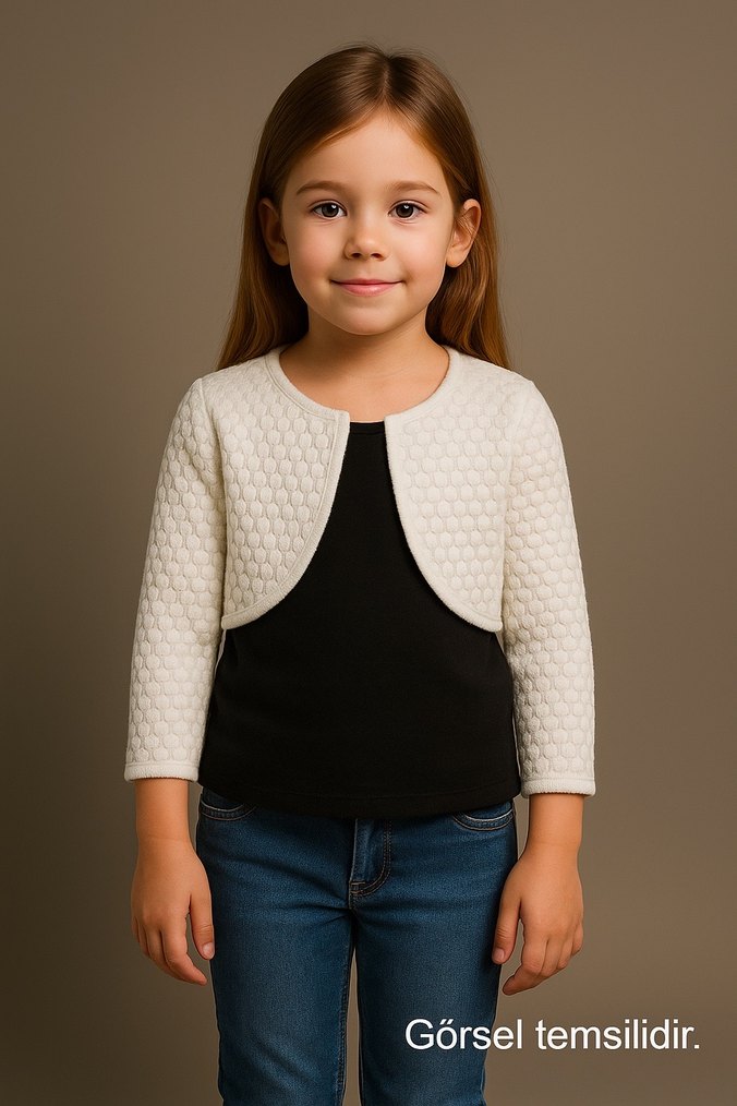 Kız çocuklarının bahar kombinlerinde sıklıkla tercih edilen beyaz dokulu triko bolero. Hem elbise hem de etek/jean üzerine şık ve hafif bir kat sağlar. Doğum günü, okul gösterisi, aile yemeği, fotoğraf çekimi gibi özel günlerde rahat kullanılır. Önü açık kısa kesimi sayesinde elbise formunu bozmaz, fotoğraflarda zarif durur. Dokusuyla premium bir görünüm verir. Renk uyumu yüksek olduğundan pastel, lacivert, pembe, ekru ve çiçekli kombinlerle kolayca eşleşir. Temizdir, yıpranma yoktur. Mevsim geçişlerinde dolap kurtarıcı parça. Kombin Önerileri: • Tüllü etek + saç bandı → davet stili • Jean + basic tişört → bahar görünümü • Okul gösterisi → sade, fotojenik sonuç • Mary Jane ayakkabı → klasik zarafet Beden: 5-6 Yaş (110–116 cm uygundur) Malzeme: %100 Akrilik | Durum: İyi
