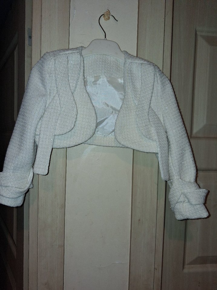 Kız çocuklar için beyaz triko bolero, kesilmiş yaka ve uzun kollu, ince dokulu keten kumaştan yapılmıştır. Fit kesim ve çağdaş tarzda.