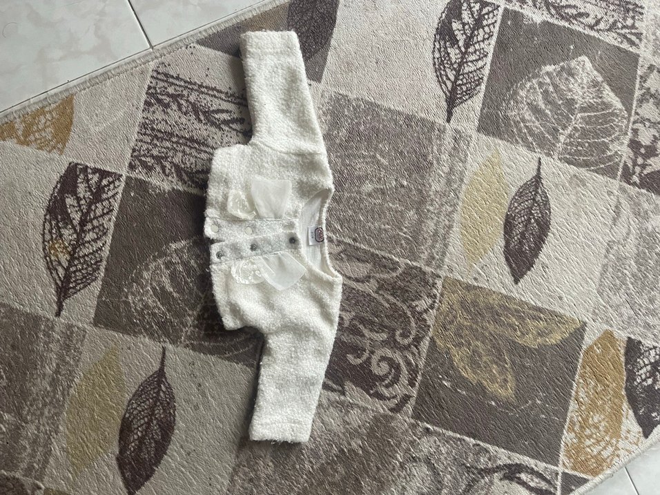Kız çocuklar için beyaz, triko dokuma, uzun kollu, V yakalı, nakış detaylı ve dar kesim bolero.