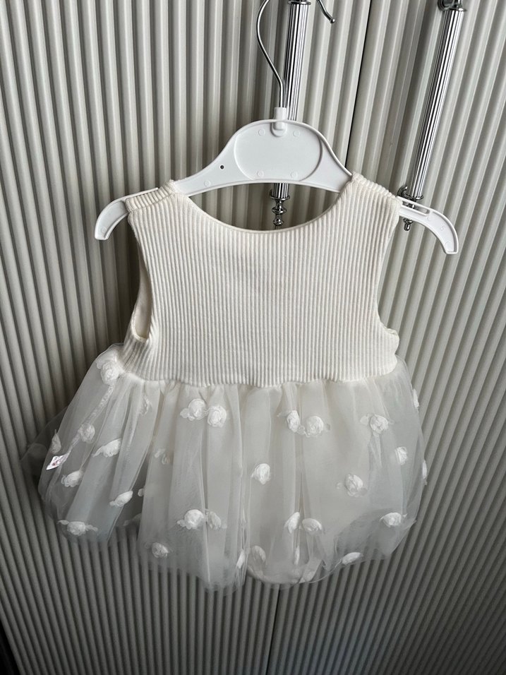Kız çocuk için triko üst ve tül etekten oluşan, kolu olmayan, yuvarlak yakalı, ince pileli detaylara sahip beyaz elbise.