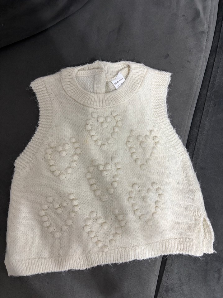 Kız çocukları için beyaz triko yelek, kolsuz ve bol kesimdir. Yuvarlak yakalı ve dokulu kalp desenleriyle sade ve rahat bir görünüm sunar.