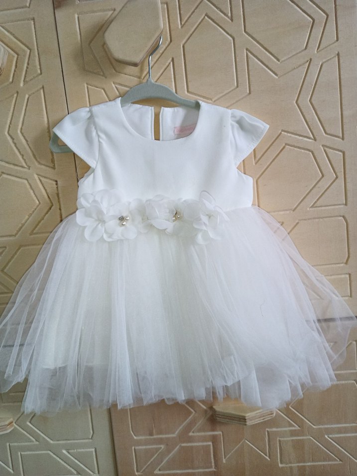 Kısa kollu, beli çiçek detaylı beyaz kız çocuk elbisesi. Tül etek kısmı ile zarif bir tasarıma sahiptir.