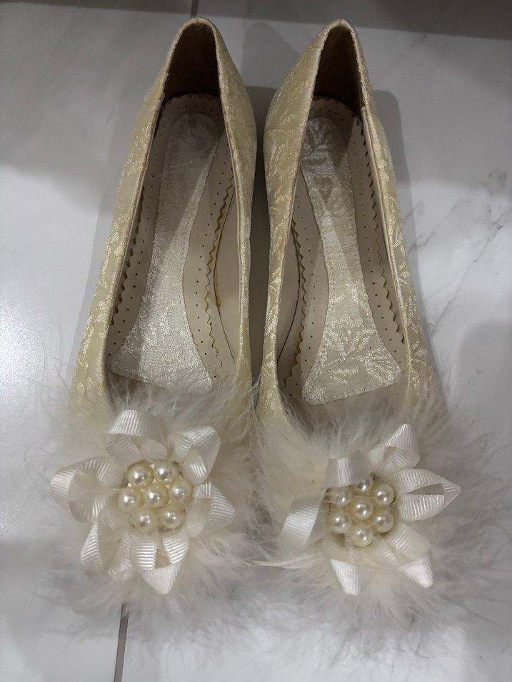 beyaz, çiçek desenli ve tüy detaylı özel gün ayakkabısı. Suni kumaştan, dantel, inci ve kurdele süslemelidir. Hiç giyilmedi.