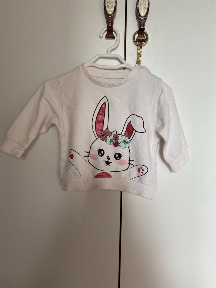 Pamuklu, uzun kollu, bol kesim kız çocuk sweatshirt. Renkli baskılı tavşan deseni ve örgü detaylarıyla dikkat çeker.