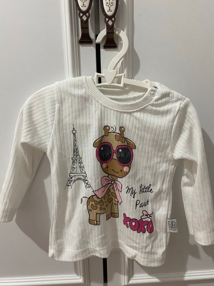 Uzun kollu, bisiklet yaka ve örgü dokulu beyaz kız çocuk sweatshirtü. Gözlüklü zürafa ve Eyfel Kulesi baskılı, trend ve dar kesim sokak stili.