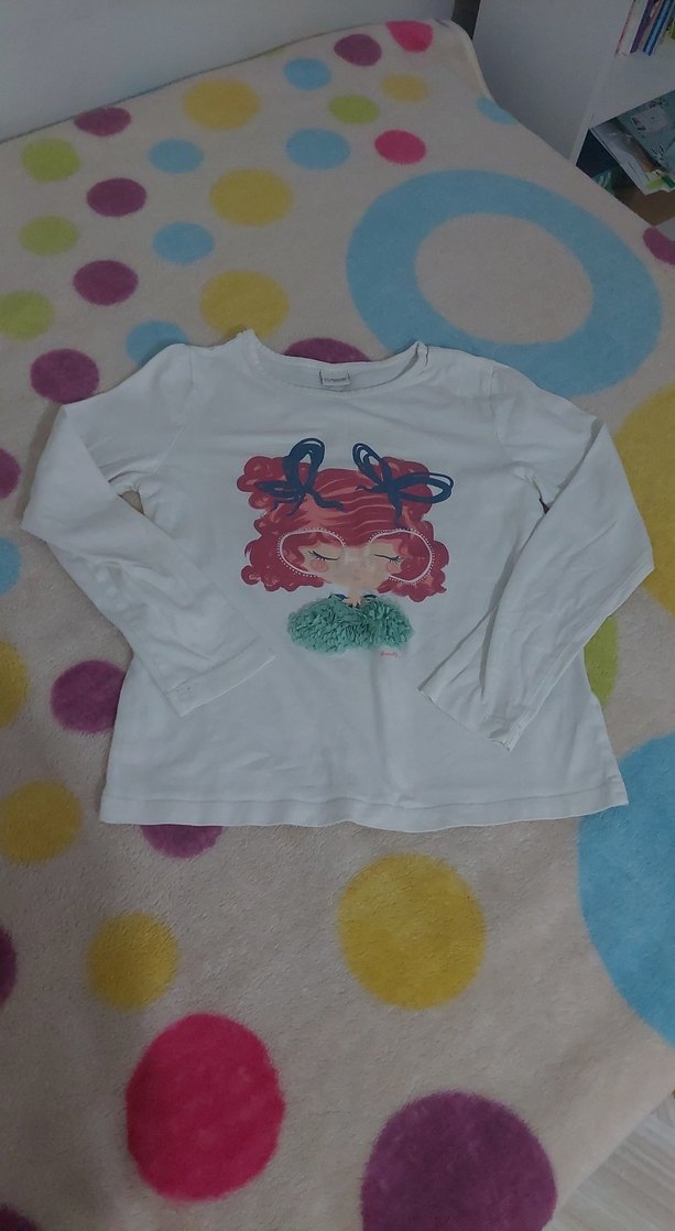 Beyaz renkli kız çocuk uzun kollu tişört, bol kesim, bisiklet yaka ve önünde fırfırlı baskılı kız figürü bulunur. Yumuşak örme kumaştan, trend sokak stili için uygundur.