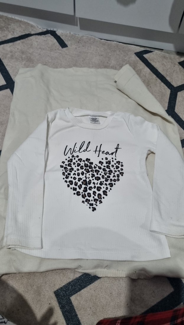 Beyaz uzun kollu kız çocuk tişörtü, yuvarlak yakalı ve bol kesimdir. Pamuklu örme kumaştan üretilmiş, kalp şeklinde leopar desenli "Wild Heart" baskısı vardır.