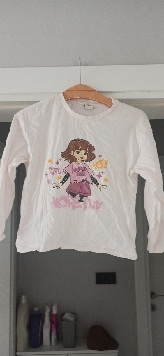 Pamuklu, beyaz uzun kollu kız çocuk tişörtü, rahat kesim ve renkli baskılı desenle bohem ve retro stil için uygundur. 1 kez giyildi