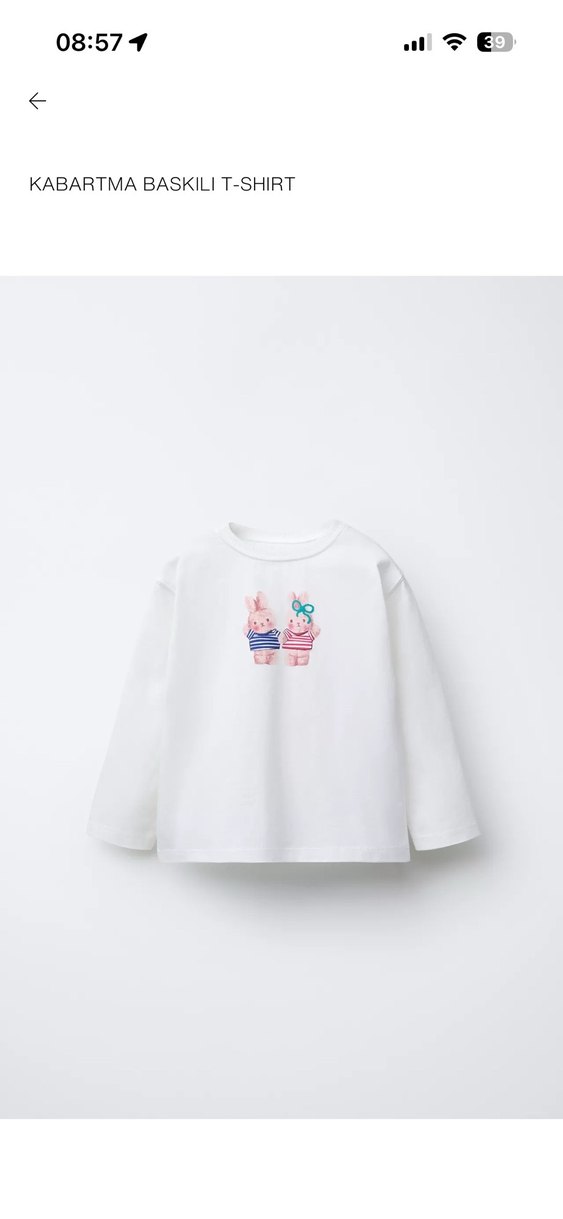 Kız çocukları için beyaz, uzun kollu ve pamuklu kumaştan yapılmış tişört. Önünde pastel tonlarda iki tavşan baskısı bulunur. Salaş kesimli ve yuvarlak yakalıdır.