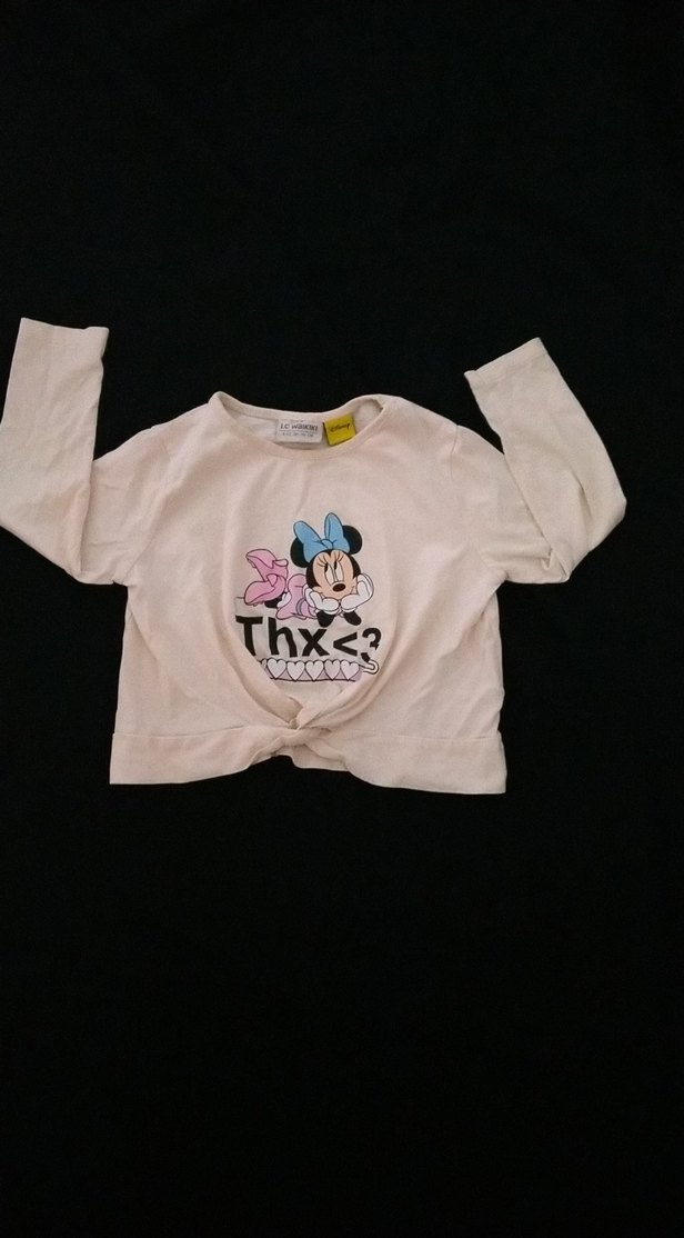 Pamuklu, uzun kollu, bol kesim ve yuvarlak yaka kız çocuk tişörtü. Örme dokulu ve pastel beyaz renkte, Minnie Mouse baskılı şık tasarım.