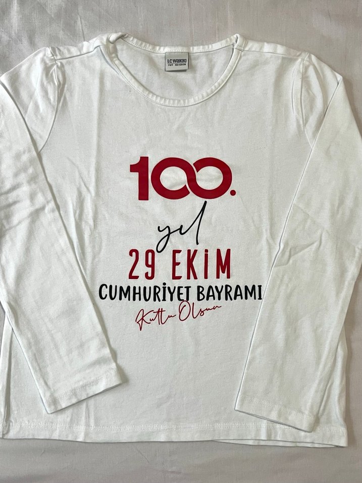 Beyaz pamuklu, uzun kollu, bol kesim kız çocuk tişörtü. 29 Ekim Cumhuriyet Bayramı'nın 100. yılına özel baskı ile tasarlanmıştır. Bisiklet yaka, sokak stili.
