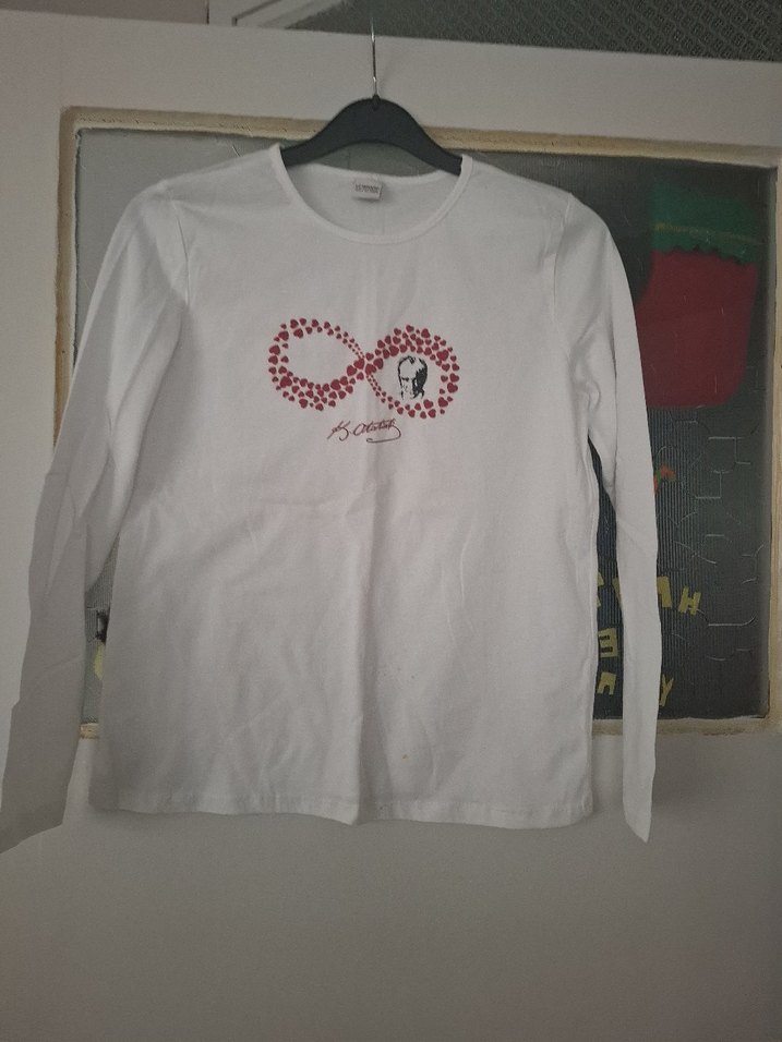 Pamuklu kumaştan, bol kesim ve bisiklet yaka uzun kollu kız çocuk tişörtü. Önünde sonsuzluk sembolü ve baskı deseni bulunur. Atatürk tshirt