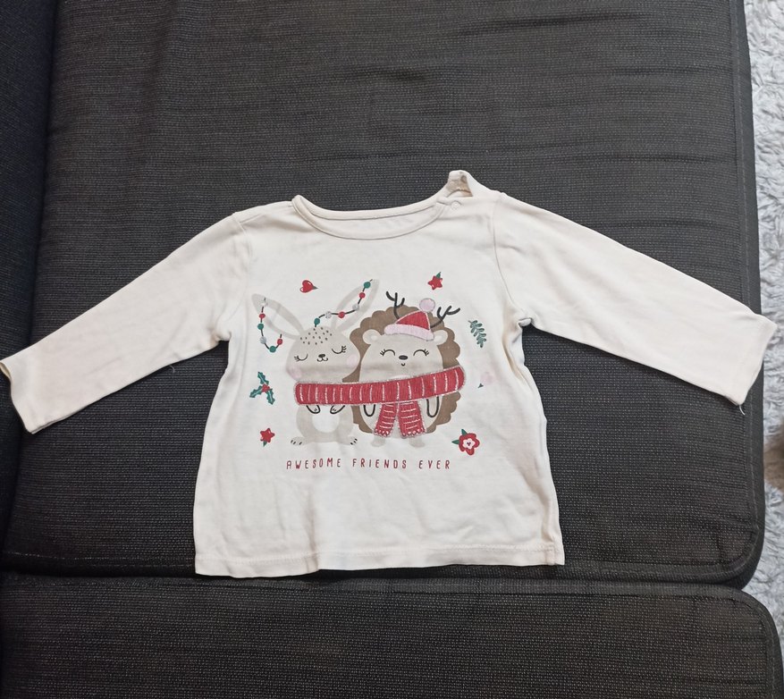 Beyaz, uzun kollu, yuvarlak yakalı kız çocuk tişörtü. Örme pamuklu kumaştan, rahat kesim. Üzerinde kış temalı baskılı sevimli hayvanlar ve "Awesome Friends Ever" yazısı var. ❄️