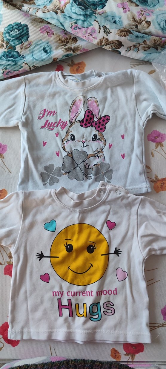 Beyaz pamuklu, uzun kollu, baskılı ve bol kesim kız çocuk tişörtü. Yuvarlak yaka, tavşan ve gülen yüz desenleriyle rahat sokak stili.