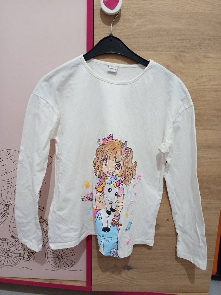 Pamuklu beyaz uzun kollu kız çocuk tişörtü, bol kesim ve renkli baskılı kız ve tek boynuzlu at deseni ile sokak stili için uygun.
