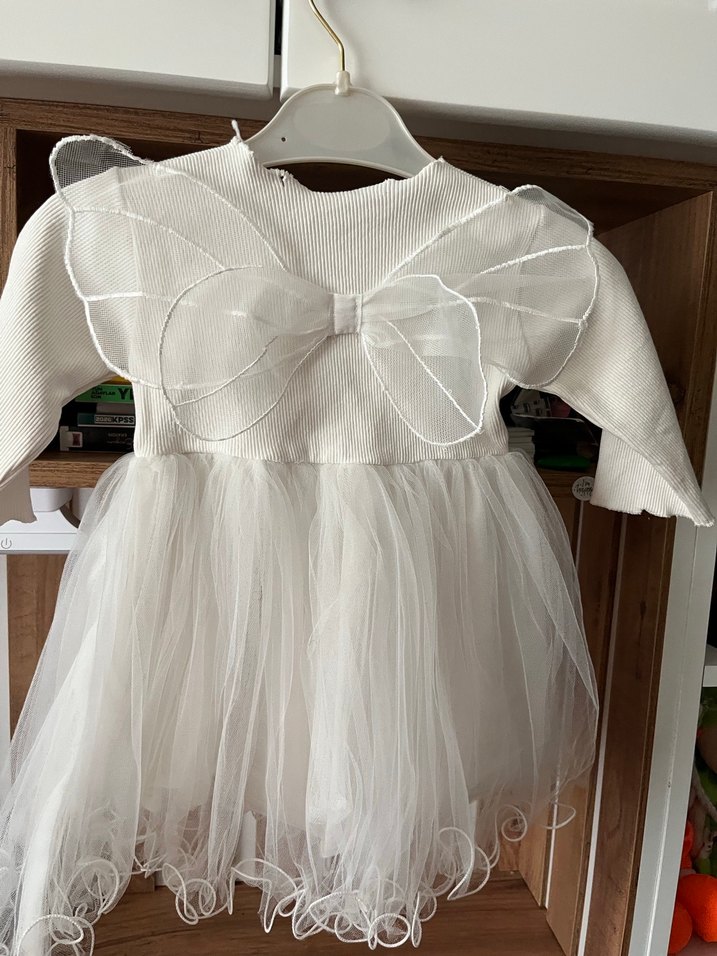 Kız çocuk için beyaz, uzun kollu, fitted kesim triko elbise. Arkada büyük fiyonk ve fırfır detaylı, etek kısmı hafif ve kabarık, normcore tarzda şık bir tasarım. Diş bugdayında gıydı ürün temız