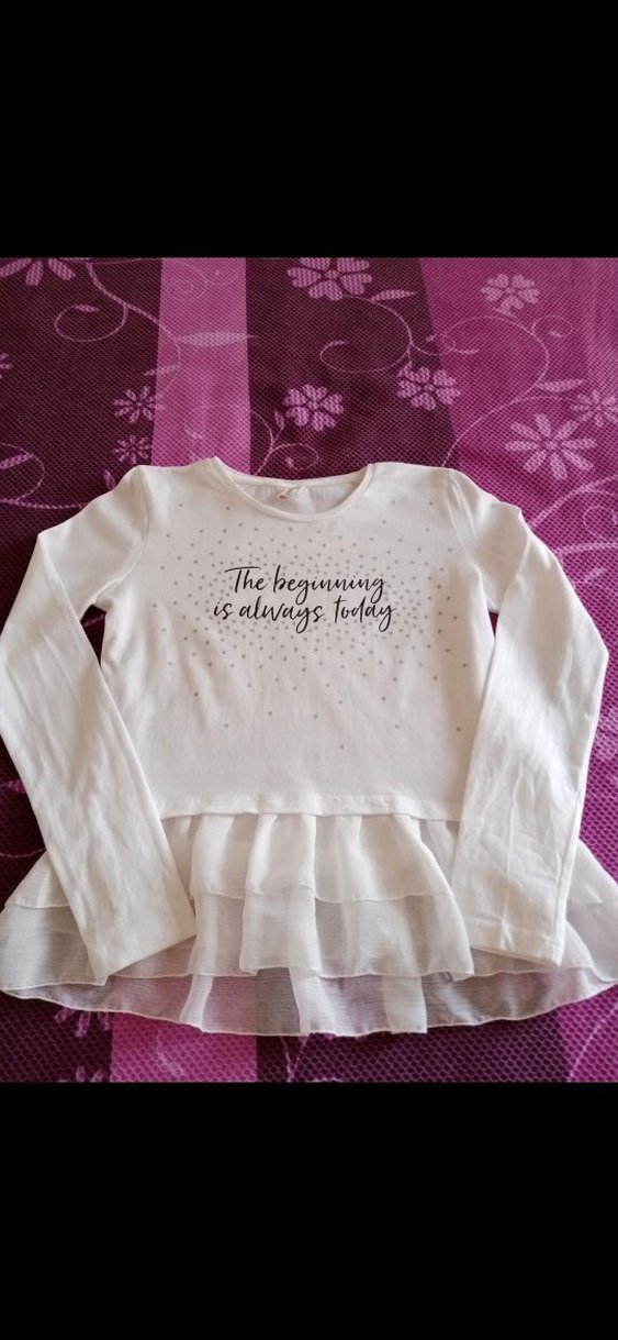 SİFİR ÜRÜN Beyaz renkli, uzun kollu kız çocuk tişörtü, pamuklu kumaştan olup, yuvarlak yakalı ve bol kesimdir. Önünde yazılı baskı ve etek kısmında fırfır detayı bulunur.