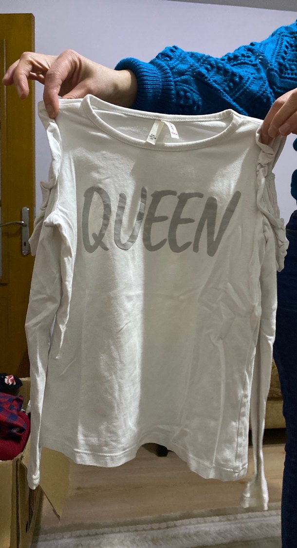 Pamuklu, beyaz renkli, uzun kollu ve fırfırlı detaylı, gri 'QUEEN' baskılı, dar kesim kız çocuk tişörtü. Trendy günlük sokak stili için uygundur.
