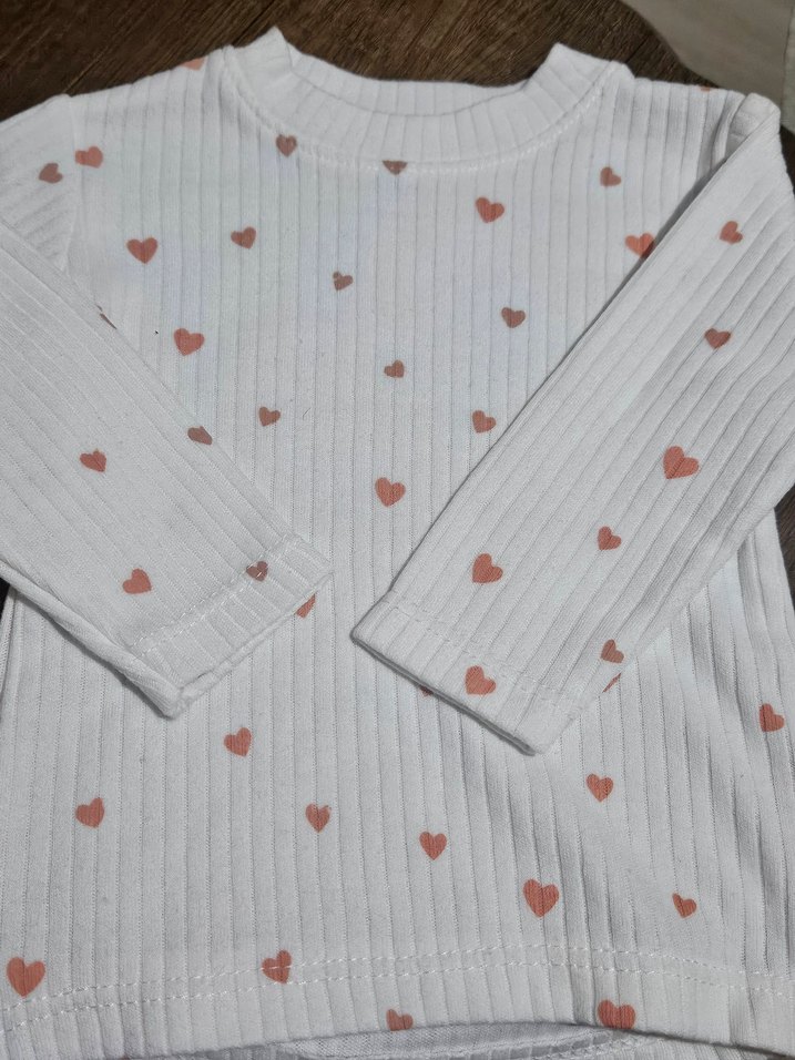 Pamuklu, örgü yapıda, ince fitilli beyaz bluz, uzun kollu ve yuvarlak yaka. Küçük kalp desenleriyle süslenmiş. ❤️ 3 aylık zıbın ve 6 aylık bluz 2 adet ürün