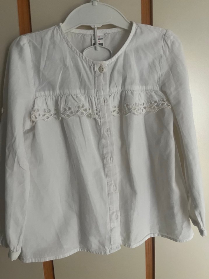 Kız çocukları için düğmeli, nakış detaylı beyaz keten gömlek. Bol kesim ve yakalı, uzun kolludur.