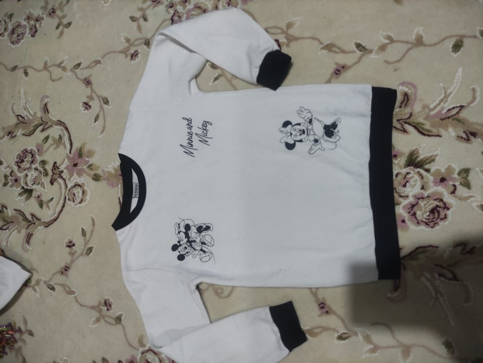 Pamuklu beyaz sweatshirt, uzun kollu ve bisiklet yaka, koyu renkli Mickey baskılıdır. Rahat ve bol kesim, sokak stili için uygundur.