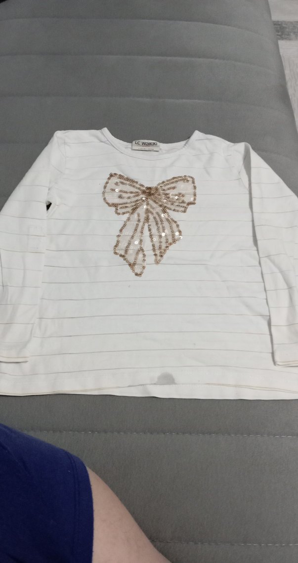 Pamuk kumaştan yapılmış, bol kesim beyaz kız çocuk uzun kollu tişört. Önünde parlak nakışlı fiyonk ve yuvarlak yaka bulunur.