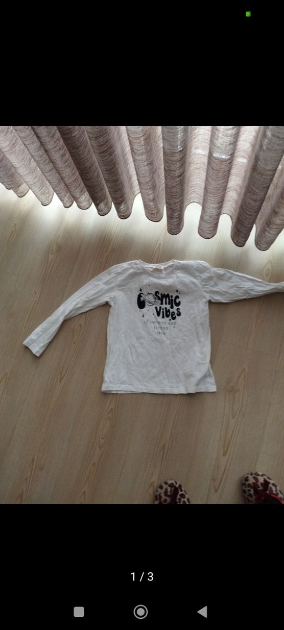 Beyaz pamuklu, bol kesim uzun kollu kız çocuk tişörtü. Düğme detaylı ve gri "Cosmic Vibes" baskılı.