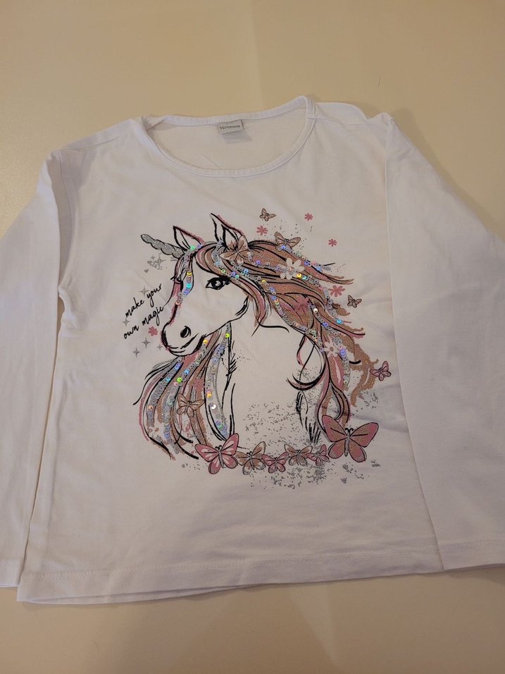 Kız çocukları için beyaz, uzun kollu, bol kesim ve yuvarlak yakalı tişört. Payetlerle süslenmiş baskılı tek boynuzlu at deseni bulunur. Yumuşak sentetik kumaştan yapılmıştır. PAMUKLU KUMAŞ SENTETİK DEĞİL