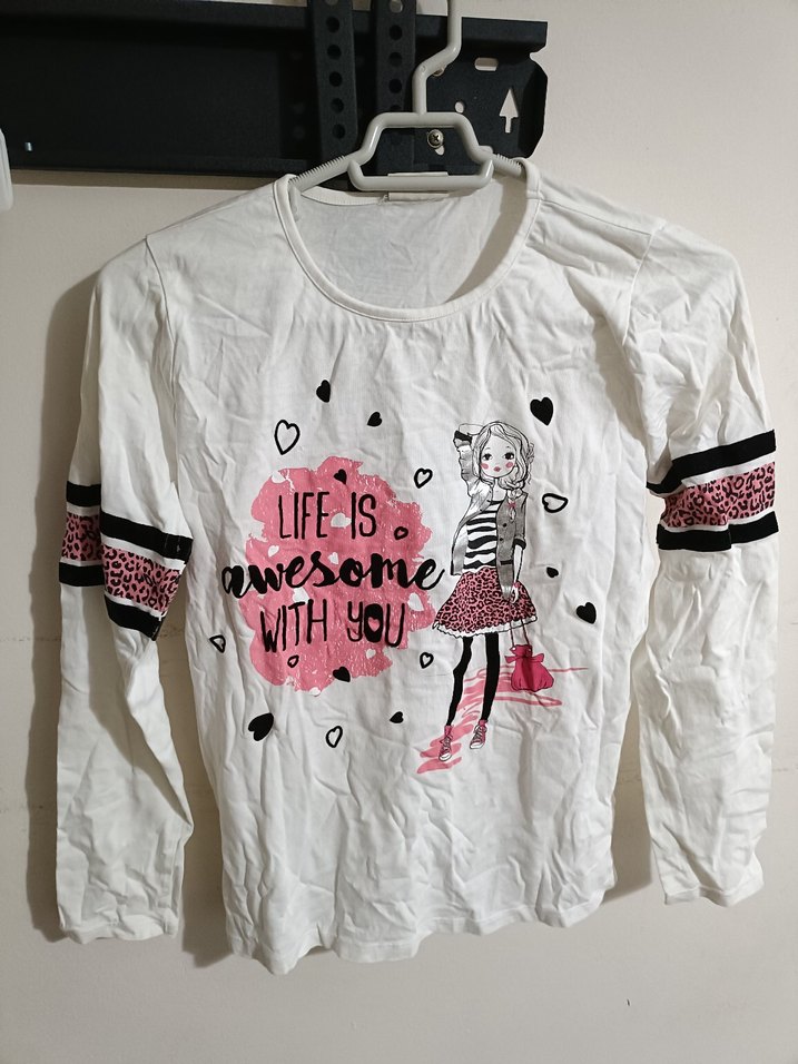 Pamuklu beyaz uzun kollu tişört, bol kesim ve yuvarlak yaka. Payet detaylı baskı ve kollarda desenli bantlar bulunur. "Life is awesome with you" yazılıdır.