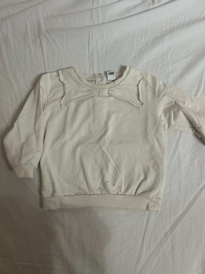 Kız çocuk beyaz sweatshirt, uzun kollu ve yuvarlak yakalıdır. Yumuşak keten kumaştan üretilmiş, sade ve fiyonk detaylıdır. Rahat ve salaş kesime sahiptir.