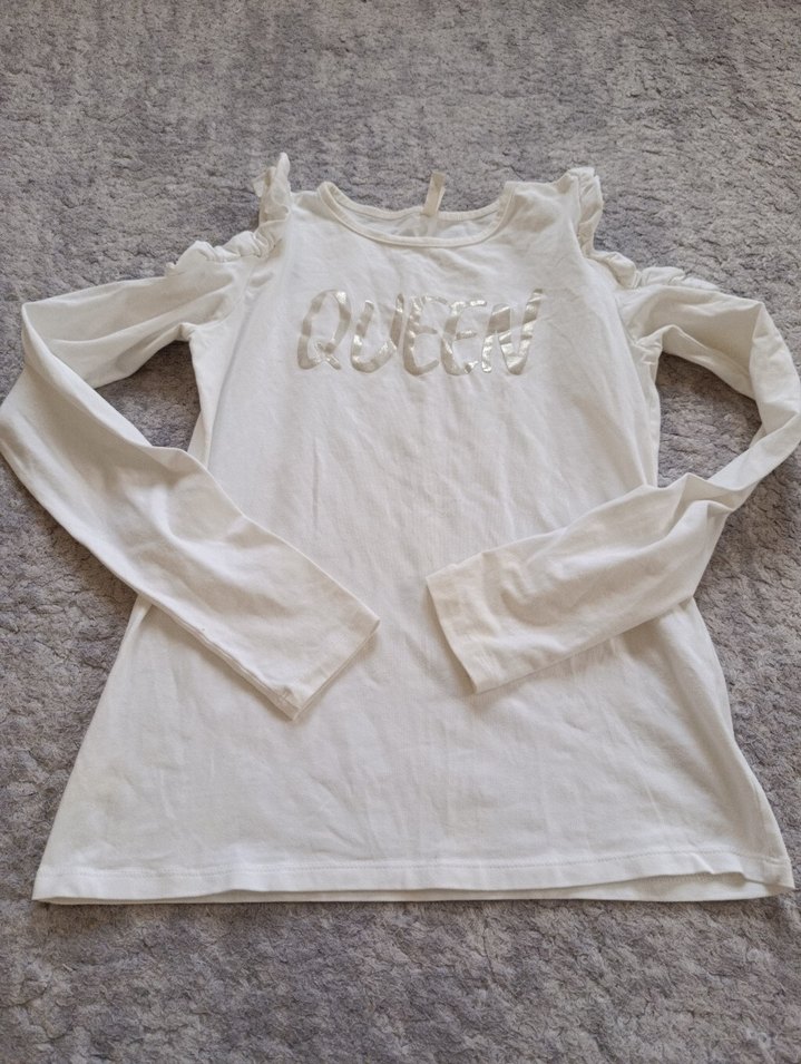 Pamuk kumaştan yapılmış, omuzlarında fırfır detaylı, baskılı "QUEEN" yazılı beyaz kız çocuk uzun kollu tişört. Salaş kesim, yuvarlak yaka.