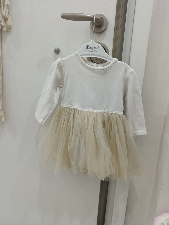 Beyaz uzun kollu, pamuklu üst kısmı ve yuvarlak yakalı kız çocuk elbisesi. Basic tasarıma yumuşak tül etek ve fırfır detayı eklenmiştir. Rahat ve sade stil için uygundur.