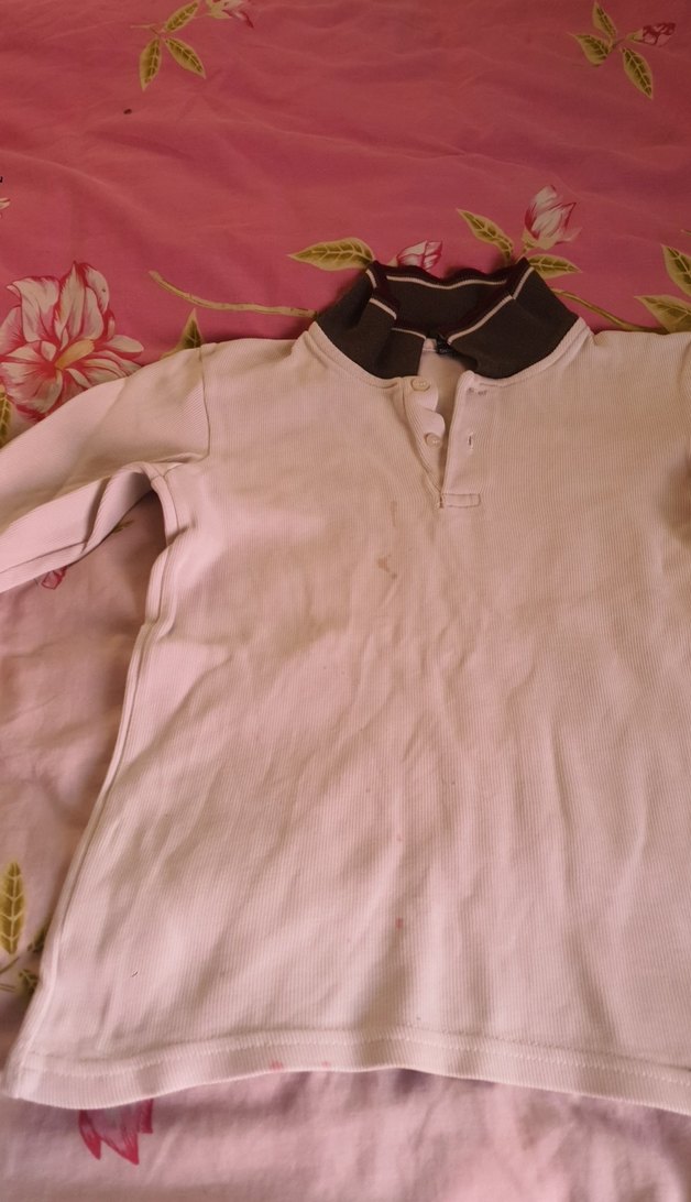 Yumuşak tekstil kumaştan yapılmış, düğmeli ve yakalı beyaz uzun kollu kız çocuk gömleği, rahat bol kesimlidir. lekesi vardir