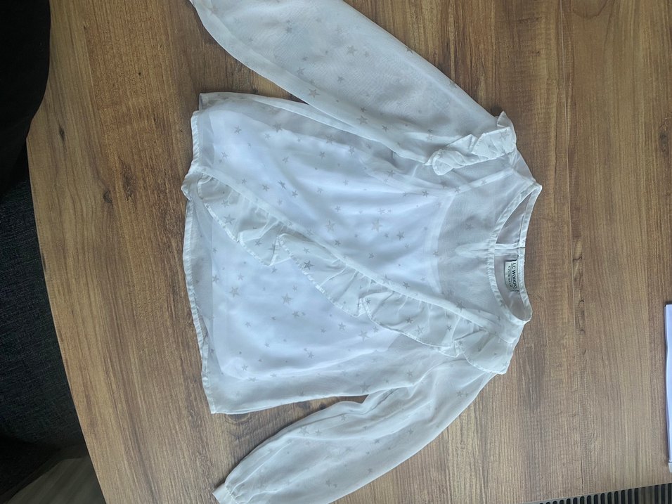 Uzun kollu, bol kesim, V yakalı beyaz keten bluz, gri yıldız desenli ve fırfır detaylıdır. Hiç giyilmedi.