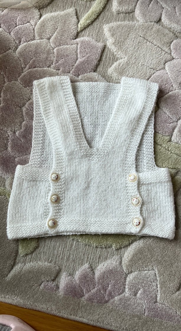 Kolsuz beyaz örme yelek, bohem tarzda ve v yaka. Yanlarda dekoratif düğmeler bulunur. Katmanlama için uygundur. İlk 1 yaşa uygun