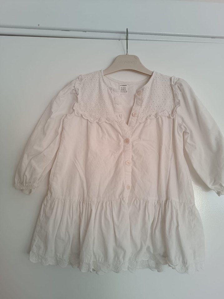 Kız çocuklar için pamuklu, kısa kollu, bol kesim beyaz gömlek. V yaka ve düğmeli, omuzlarda hafif işlemeli sade tasarım. Rahat ve basit tarz.