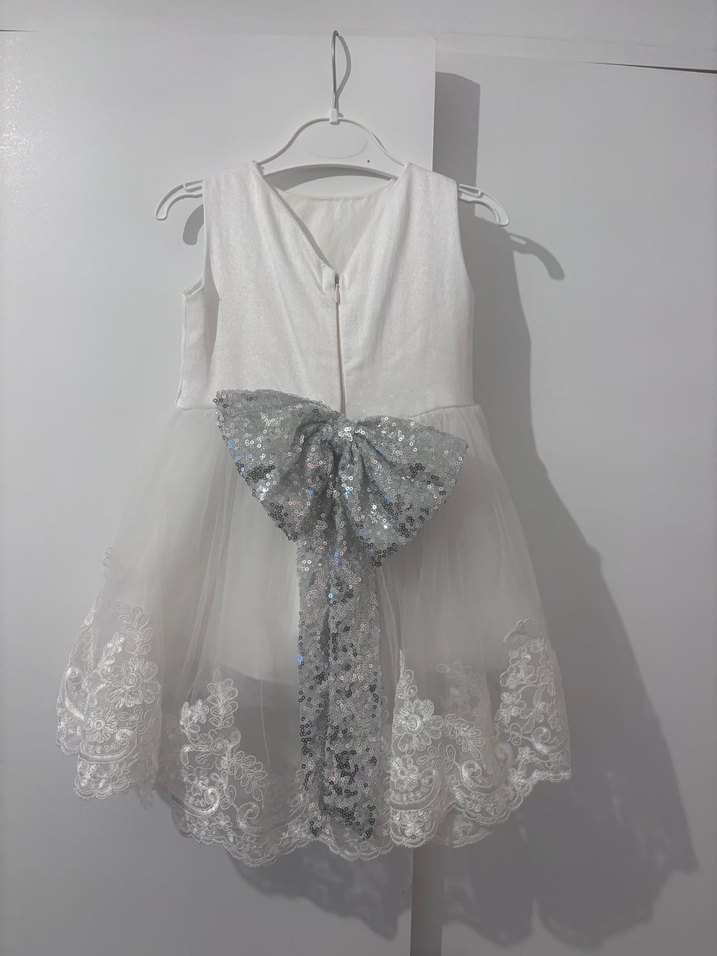 Kız çocukları için kolsuz, v yakalı, işlemeli etekli beyaz elbise. Belde büyük gümüş renkli fiyonk detayıyla modern klasik tarz sunar.